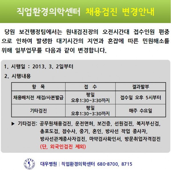 [안내] 직업환경의학센터 채용검진 변경안내 페이지 정보 대우병원 작성일13-03-12 23:23 조회98,399회 댓글0건 본문 [안내] 직업환경의학센터 채용검진 변경안내 이전글 다음글 목록